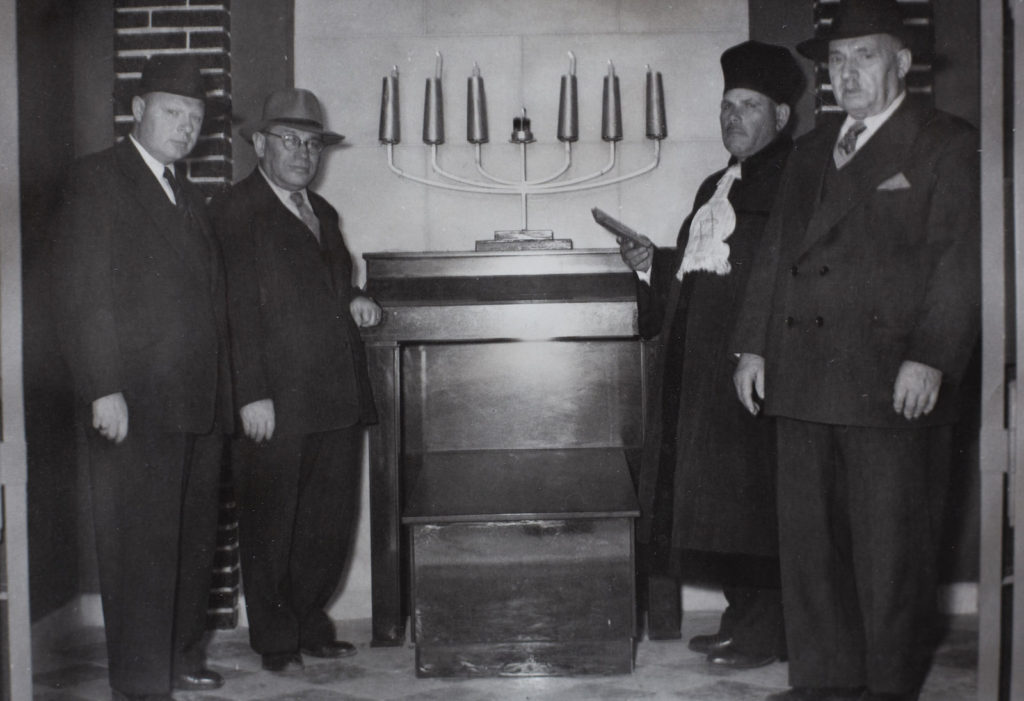 Inauguración de monumento en el Cementerio Israelita con Moisés Blejer, Bernardo Wainsztein, Sr. Handelsman y Jazan.