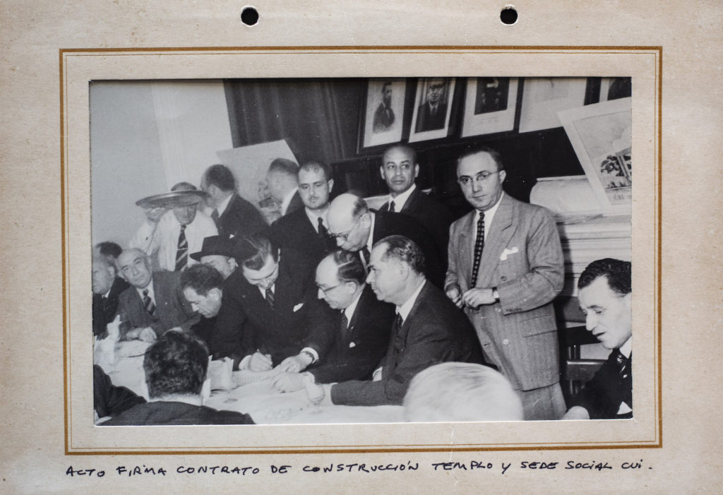 Acto de firma de contrato de construcción del templo y sede social del Centro Unión Israelita. Año 1953. Entre los presentes se identifica a Boris Litvak, José Eizikovitz y Moisés Blejer, entre otros.