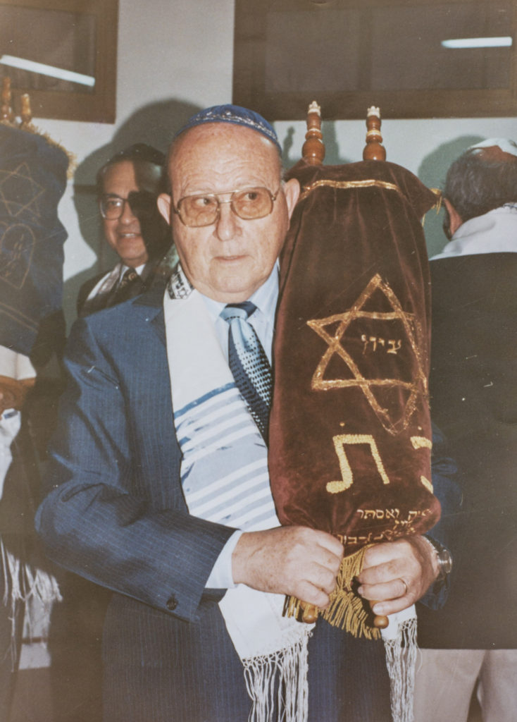 Salomón Misonischnik portando la Torá y Juan Matchey (atrás). Celebraciones en el Centro Unión Israelita.
