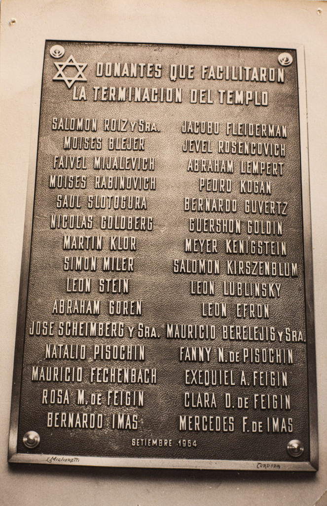 Placa conmemorativa a los donantes del Templo Beith Israel. Año 1954.
